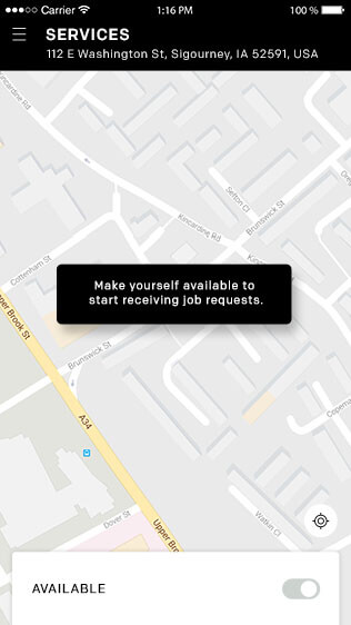 A toggle switch is provided on the home screen of your app to make yourself available or unavailable. You will be able to receive the job requests only when this availability switch is on. Turning off the availability switch will make you offline on the app.